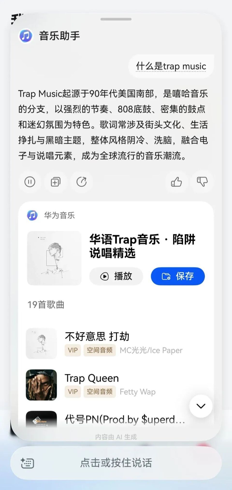 首先是音乐助手,你可以理解为这就是一个可以随时对话的音乐管家,它集成了华为小艺系统级智能体,所以能精准识别问题,并按要求处理任务。