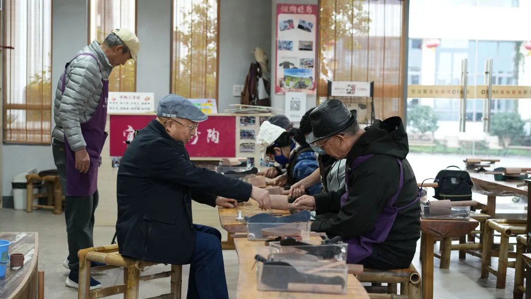 祖孙三代一家四口动手玩泥、认真制陶,沉浸在传统手工艺的乐趣之中,场面温馨动人。杨明华先生在仔细观摩紫砂研学导师演示古法制陶流程后,更是结合自身深厚的教育理念,语重心长地指导孙子,寓教于乐,传递出对传统文化传承的重视与关怀。祖孙三代共同参与、互动学习,其乐融融。
