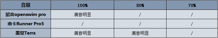 当三款耳机同时将音量开到最大,韶音OpenSwim pro和墨觉Terra的漏音明显,而南卡则几乎听不到什么耳机里的内容,讲三款耳机音量降到80%左右,韶音漏音情况消失,音量降到70%时墨觉Terra漏音情况消失。