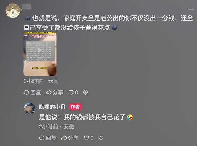 看到这也有不少网友都十分共情小贝,觉得男的给了几千块钱就感觉自己付出了很多,但家里吃的喝的用的哪个不都是女人弄得。