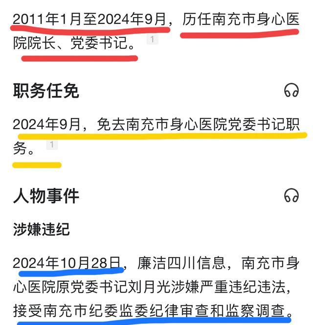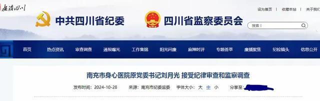 10月28日,南充市身心医院原党委书记—刘月光涉嫌严重违纪违法,正接受南充市纪委监委纪律审查和监察调查。