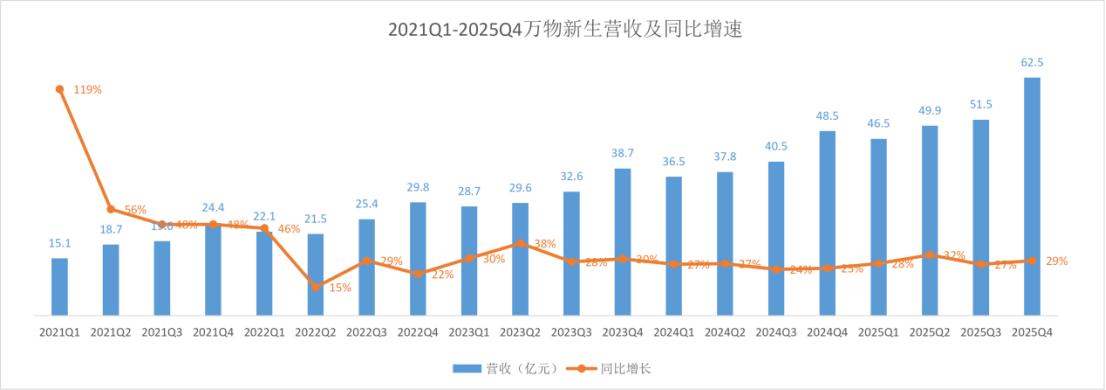 盈利狂飙,但“扩张引擎”骤然熄火毫无疑问,万物新生2025年的账面数据是极其惊艳的。全年总营收达到210.5亿元,同比增长28.9%;更为历史性的一刻是,集团首次在GAAP准则下实现了全面盈利,年度经营利润和净利润分别达到4.6亿元和3.4亿元。