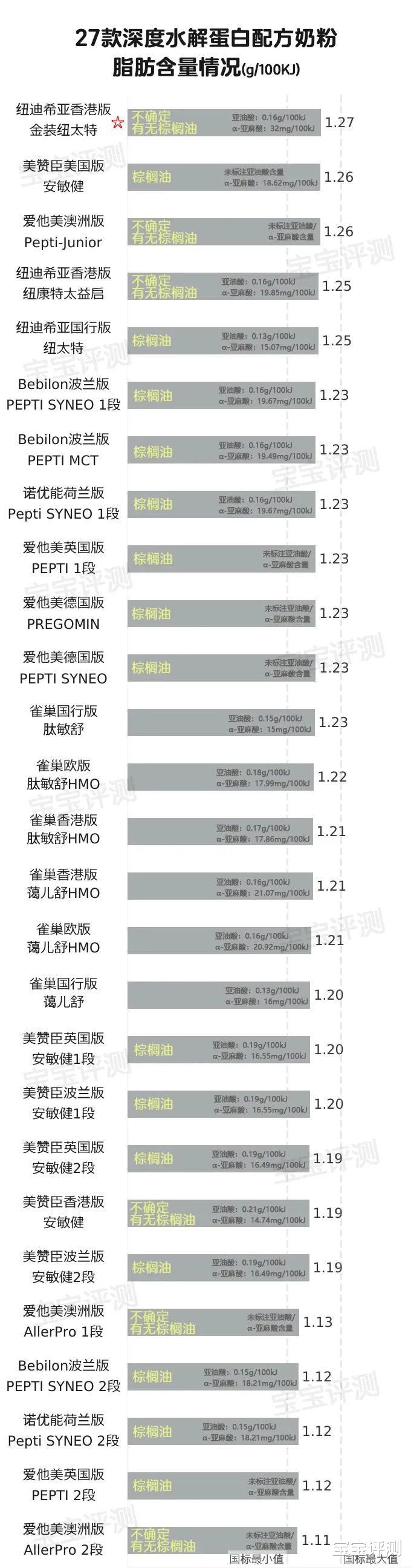 1、27款深度水解奶粉的脂肪含量在1.11—1.27g/100kJ之间,均在中国特配食品国标规定的含量范围内。