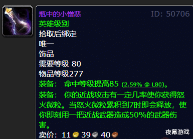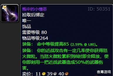 瓶中的小憎恶加85命中,特效是近战攻击有几率获得怒火微粒,当怒火微粒累积到7时,使你立刻用近战武器造成50%的武器伤害。