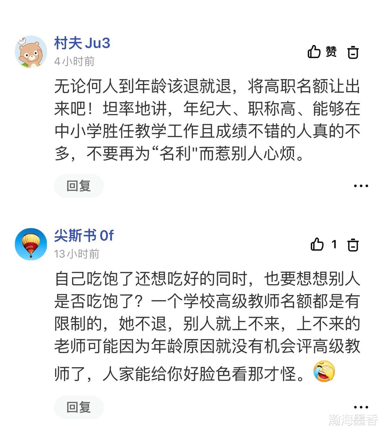 网友一:老教师不走,年轻教师就没有成长空间,教师的工作积极性受到很大影响。老教师到了岁数就不要太贪心了,赶紧给年轻教师腾地方吧。