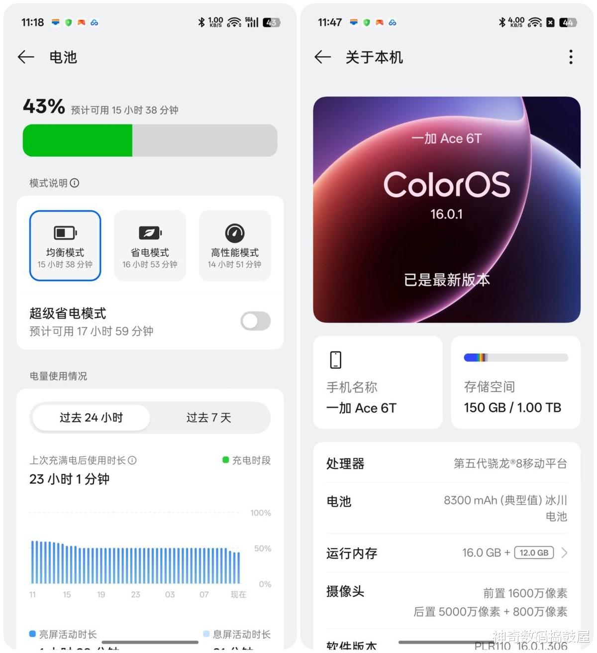 续航是一加Ace 6T的核心亮点,其内置的8300mAh冰川电池,是目前同价位机型唯一8000mAh以上的大电池配置。这块电池采用全新球形X25硅碳负极材料(硅碳含量15%),能量密度达865Wh/L,在提升性能的同时有效控制了体积。配合ColorOS 16系统的深度优化,通过智能调控进一步提升电池效率、减少无效功耗。硬件与软件的双重协同,让一加Ace 6T拥有更持久的续航能力。