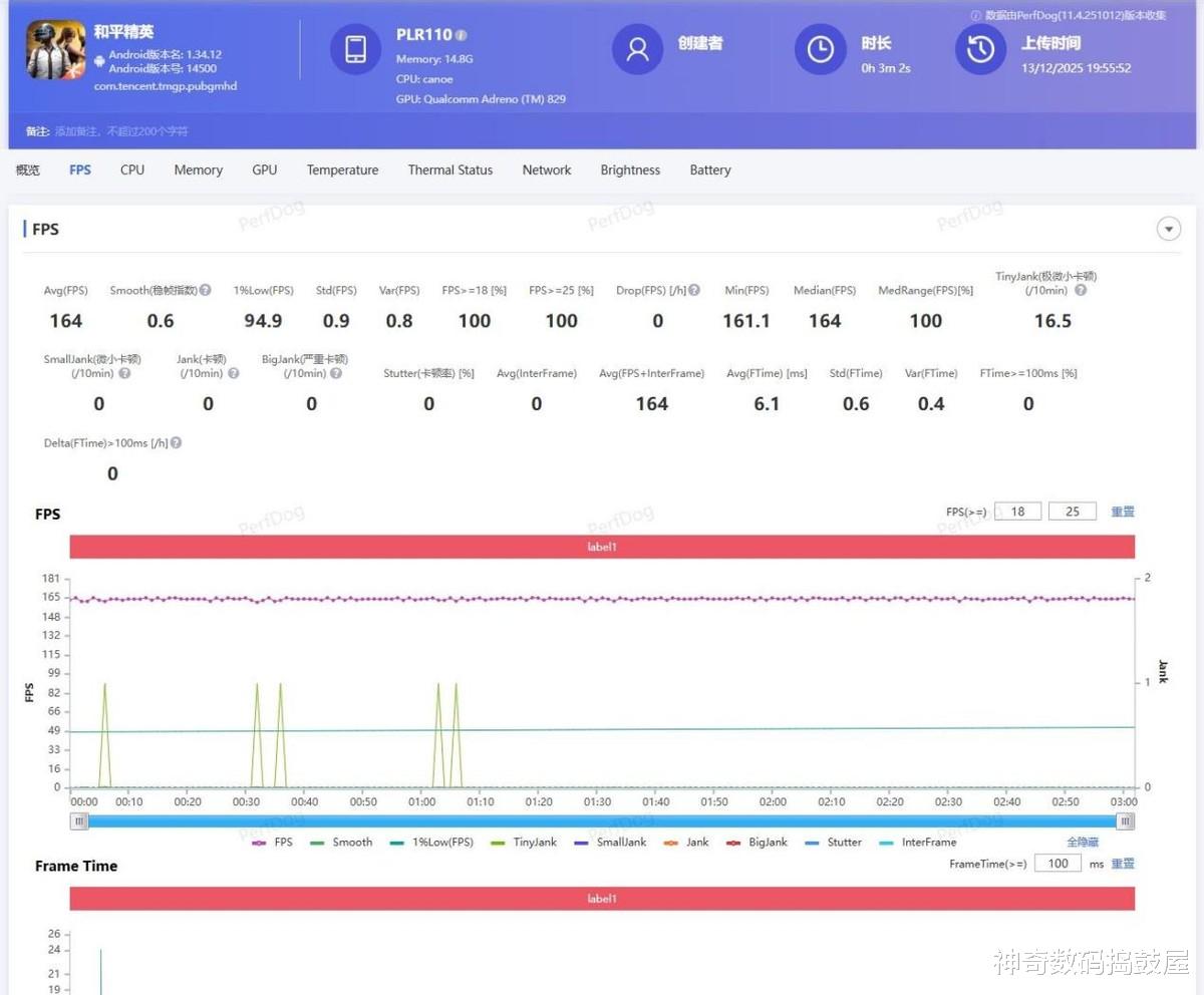 PerfDog性能狗测试运行原生165帧模式《和平精英》,一加 Ace 6T平均帧数达164帧,几乎满帧运行,全程无卡顿掉帧,表现十分出色,同时以平均功耗4.6W的超低功耗实现满帧输出,性能释放堪称标杆级表现。