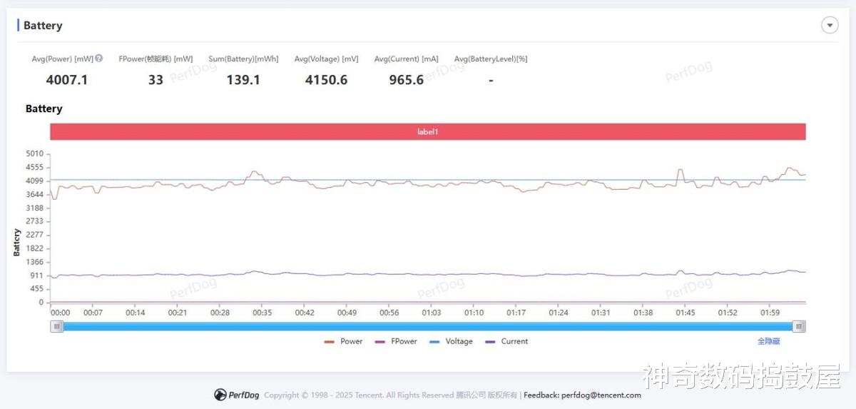PerfDog性能狗测试《原神》,通过游戏助手开启超级帧率模式,帧率波动很小,平稳成直线,保持120满帧运行,1% Low帧稳定在106.9帧,平均功耗4W,游戏全程帧数稳定,同样没啥压力。