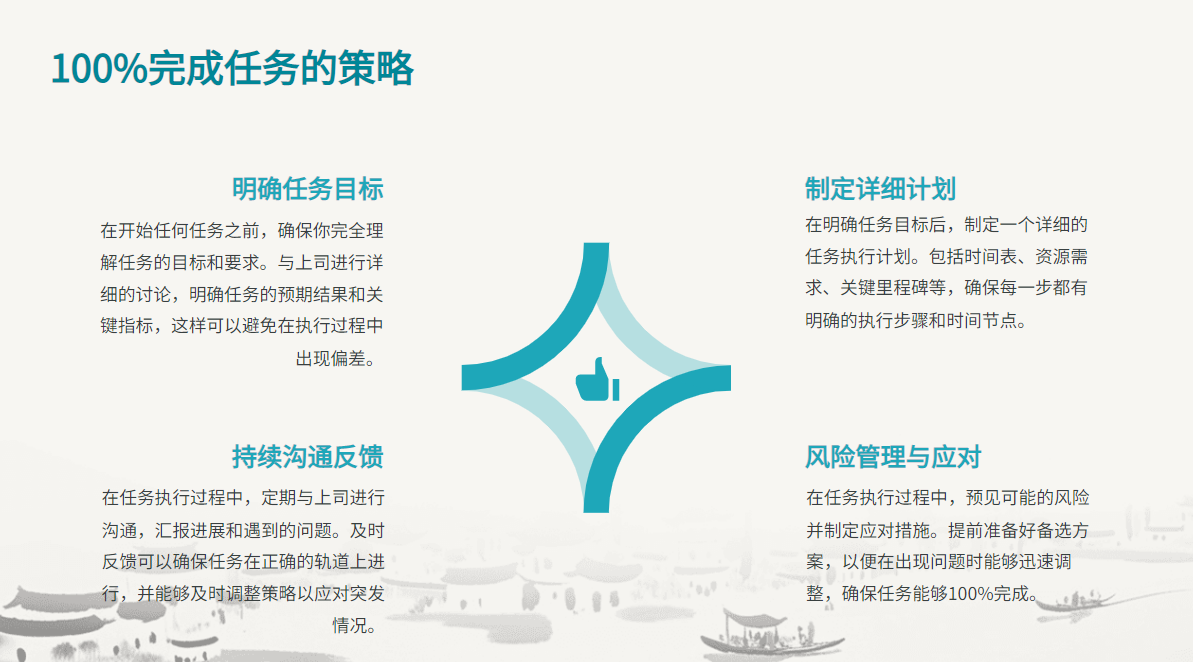 实操方法:接到任务时先拆解领导的核心诉求(显性需求+隐性期待),交付时提供ABC三套方案(基础执行版/优化版/创新突破版),用「附加价值」制造惊喜感