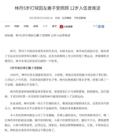 信息来源:人民网 2024-04-29 林丹5岁打球因左撇子受照顾 12岁入伍曾叛逆