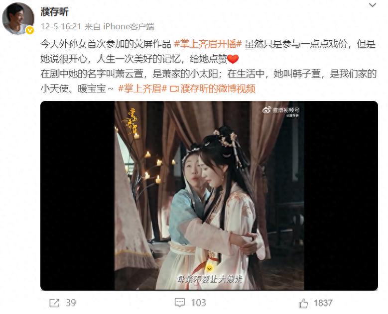 2025年12月5日,著名演员濮存昕在个人社交平台连发两条微博,祝贺外孙女韩子萱参演的网络短剧上线。