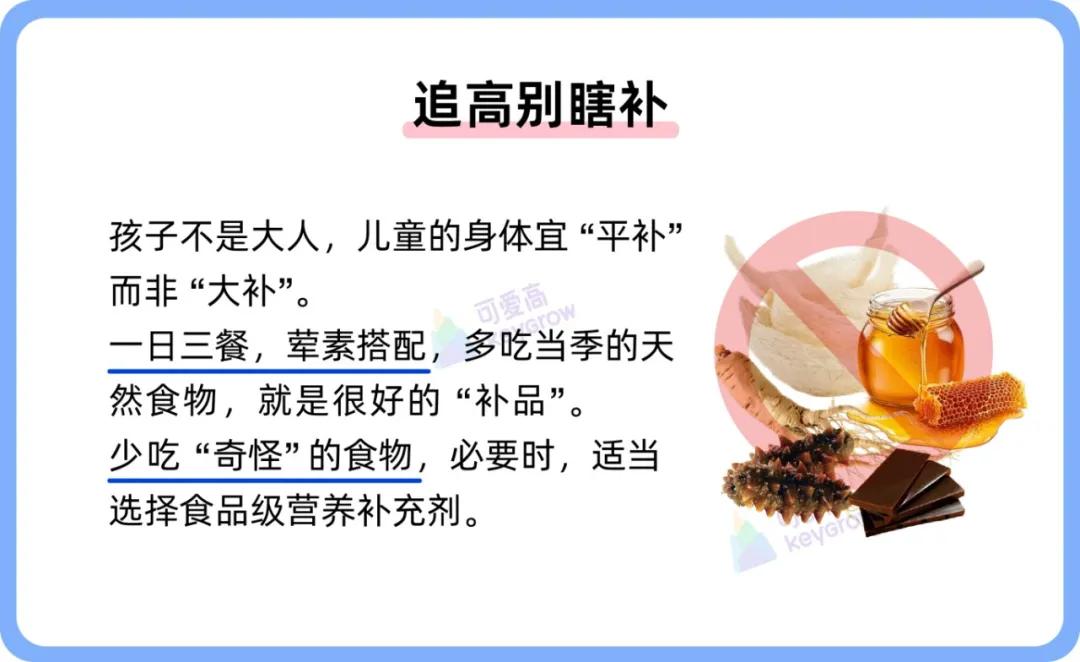 这些补品可能含有激素或类激素物质,同样会扰乱孩子自身的内分泌系统,容易导致性早熟,加速骨骺闭合。