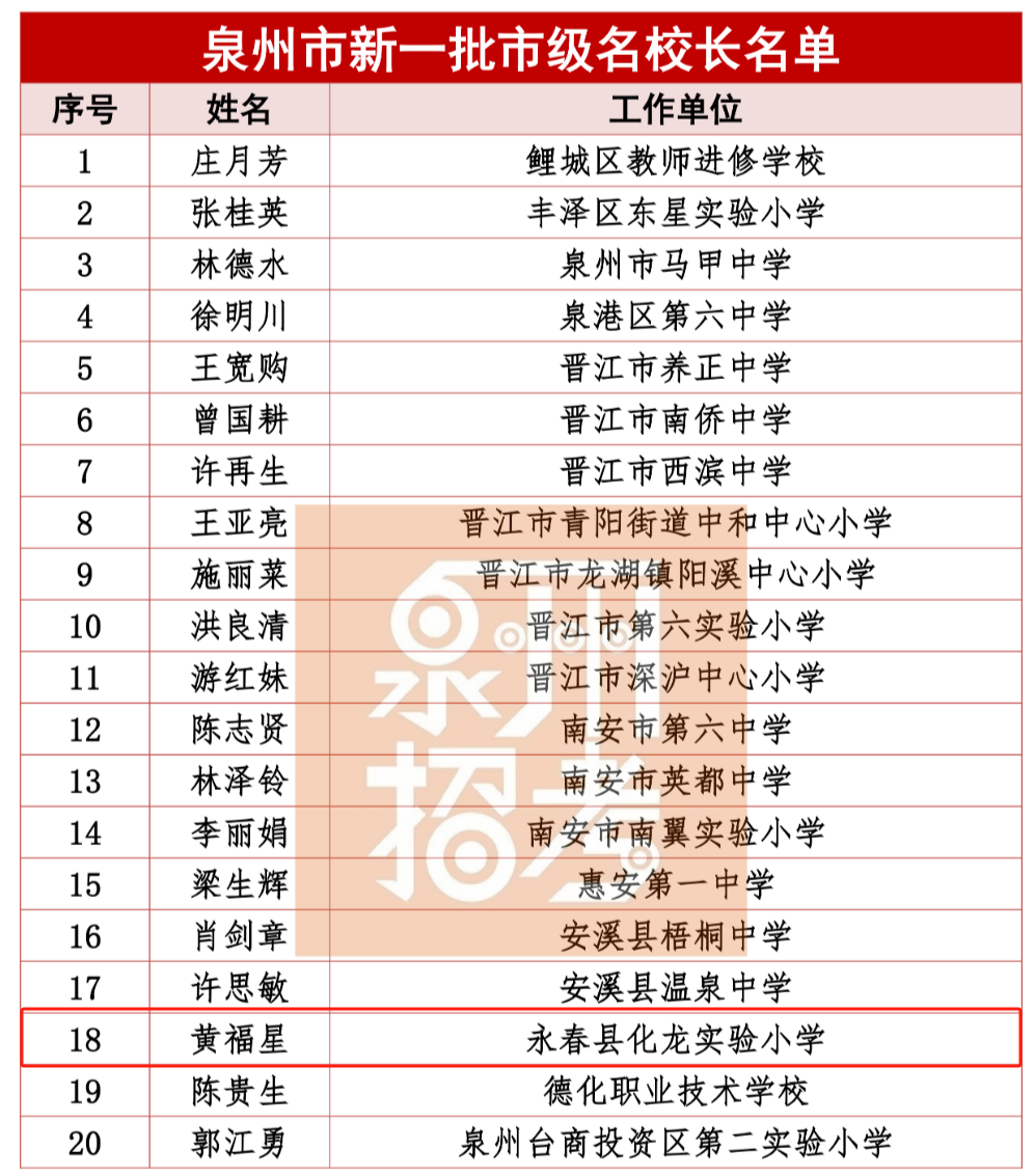 日前,泉州市教育局公布新一批市级名校长名单,共20人入选。来源:泉州市教育局