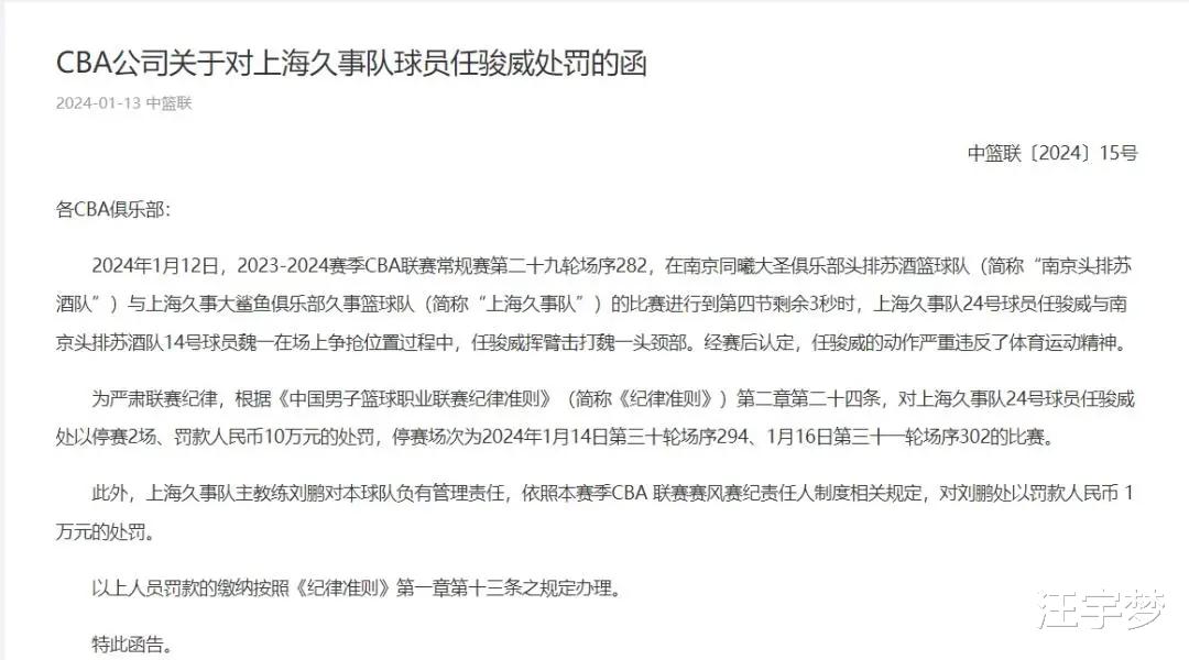 CBA官方今日宣布了对任骏威的惩罚结果。上海久事队球员任骏威因为在比赛中对南京苏酒队球员魏一进行头颈部肘击,被认定严重违反了体育运动精神。他被罚款10万元并停赛两场,而上海久事队主教练刘鹏也因为管理责任被罚1万元。