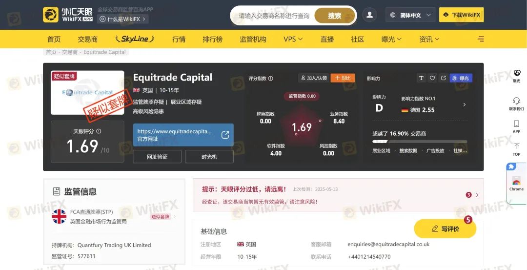 但根据外汇天眼调查,它的监管号根本是套牌,冒用了Quantfury Trading UK Limited的名字,实际上并无实质监管。而且它风控为零,评分只有1.69,属于最底层黑平台。
