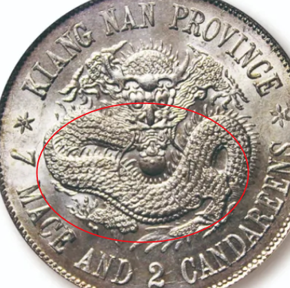 这枚币的亮点在于它那条“坐龙”。广东龙洋的龙图和其他地方不一样,龙是盘坐着的,显得非常威严。这枚拍出高价的币,龙眼炯炯有神,龙须根根分明,一点磨损都没有。
