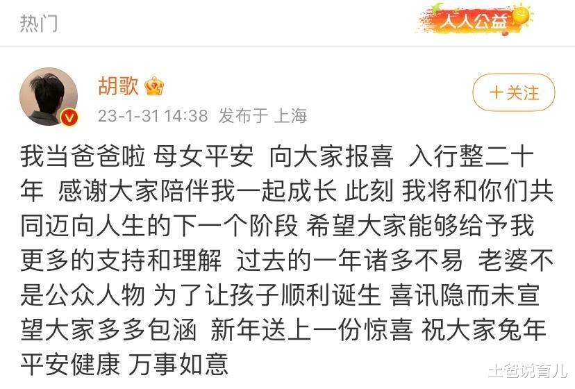 1月31日,胡歌自曝官宣结婚生女一事引爆了热搜,给粉丝和喜爱他的观众一个新年大大的喜讯:”我当爸爸了,母女平安,向大家报喜......不是公众人物......“