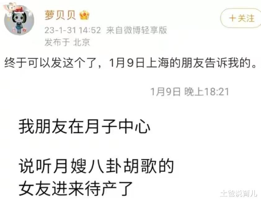胡歌官宣后,有网友曝出自己的八卦,在今年1月9日的时候,月子中心的月嫂透露胡歌的女友要来待产了。
