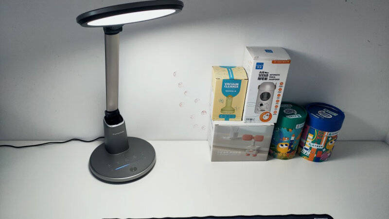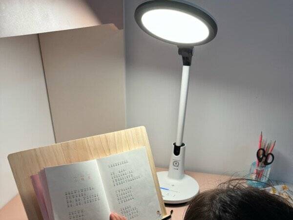 这款台灯符合国家AA级照度,140颗LED组合搭配大约 20cm的大发光面,提供360° 环绕光输出,实现桌面宽域柔和照明;配合棱镜导光板发光技术,光线柔和,减少眩光,模拟自然光的光谱分布。灯头可手动上下左右调节,支持按照不同桌面与姿势定向照明。不过在光线表现上在一些较大的桌面或需要大面积照明的场景下,可能存在光照覆盖不够全面的情况。