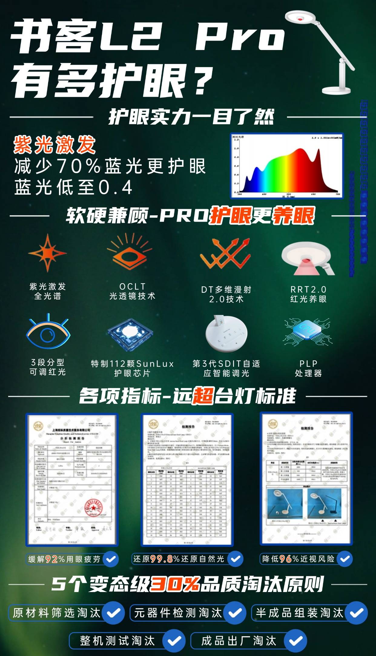 书客有着丰富的“护眼”光源构造设计与研发经验,早年主要是专注于企业级“安全”生物光学技术研发,为了死磕“医学养护眼”效果,书客坚持一款产品专注数年研发,迭代升级26次,优化200多个性能细节,做了大量技术创新,在第三代SDIT自适应调光技术、RRT2.0红光养眼技术、特制专研112颗SunLux护眼芯片等16项黑科技加持下,实现99.8%还原自然光、提升89%柔和度同时做到“对眼睛0伤害”和降低96%近视风险的护眼效果。