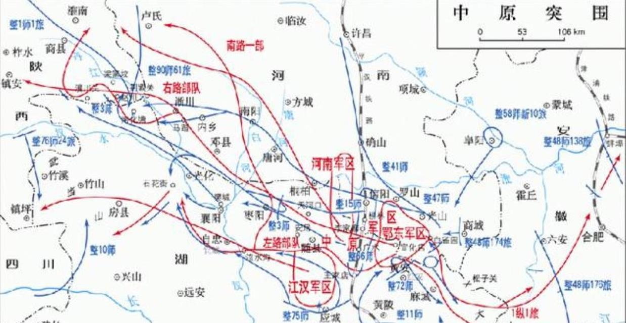 图|中原突围鉴于敌强我弱的形势,党中央以及中央军委立即指示中原军区:“立即突围,生存第一,胜利第一。”收到党中央指示后,中原军区迅速布置,除中原军区第一纵队第一旅伪装主力,吸引敌人注意,将主力部队分为左右两路,伺机突出重围。右路纵队在李先念、郑位三的率领下,于26日晚秘密由宣化店向西北方向突围;左路纵队由王树声率领,由光山县泼陂河向西突围。事实上国民党军早已经预料到,我军中原军区突围的部队,急需要北上进入陕甘宁地区,与党中央会合,于是国民党军急调整编第3、第15、第41师和整编第47师主力及位于陕南地区的第一战区部队整编第90、第1、第76、第36师各一部实施尾追和堵截。考虑到战场严峻形势,中央致电中原局以及中原军区:“胡宗南有强兵节节堵击,北上很难通过……我中原军队全部应遵守中央电文,在鄂、豫、皖、川、陕五省境内进行机动灵活作战,摧毁国民党统治机构,牵制国民党大批军队,配合我华北、华中主力作战。”就在国民党军出动大批兵力,对我军围追堵截时,还耍弄了另一套“和谈”的把戏。邀请我军代表赴西安和谈。尽管从中嗅到了阴谋的意味,但为了体现我们的诚意,中原军区决定派代表北上赴西安和谈。王震选择的两名代表为干部旅旅长张文津、旅政治部主任吴祖贻,两人原来就是359旅原军调部武汉军调处第九执行小组,曾赴武汉参加和谈,拥有与国民党军打交道的经验。