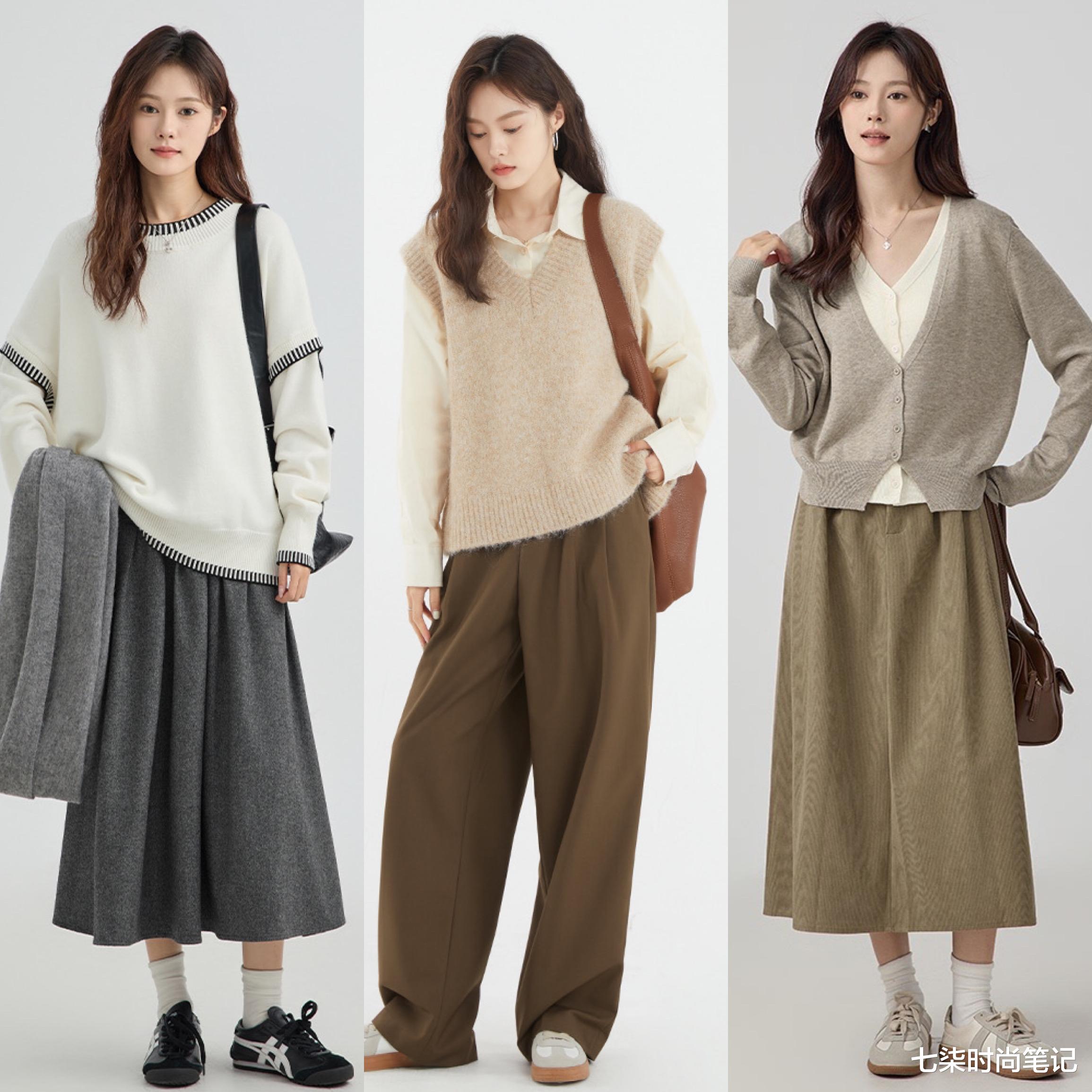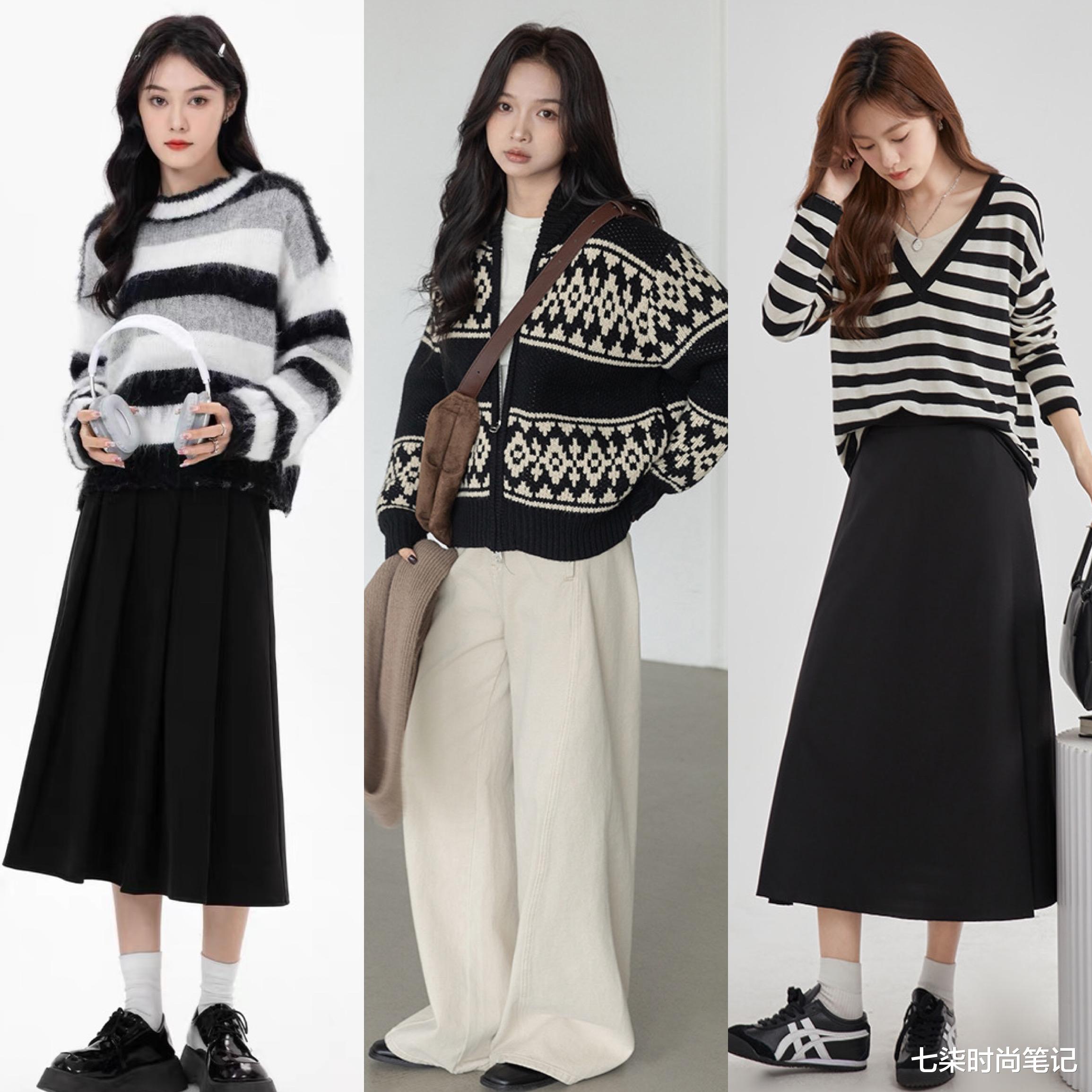 百褶裙、伞裙、直筒裙、小黑裙和卫衣都很搭,搭配上想偷懒的话,可以直接选套装,不想穿得太休闲随意,更推荐简约的圆领款。