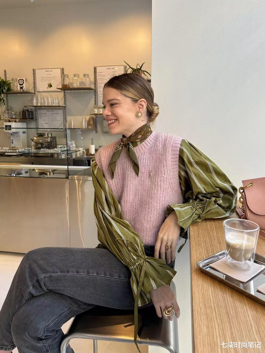 如果衣橱里有一些特殊款式的衬衫,日常穿得不多,这时候也可以通过叠穿基础款来拯救。比如这种条纹结合喇叭袖的法式衬衫,本身就很有亮点,想要更日常,就可以叠穿一件基础款背心搭配牛仔裤,来中和它的跳跃感。