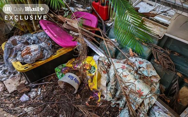 2000平方英尺的建筑内堆满了各种垃圾,甚至包括游泳池也被垃圾填满了。