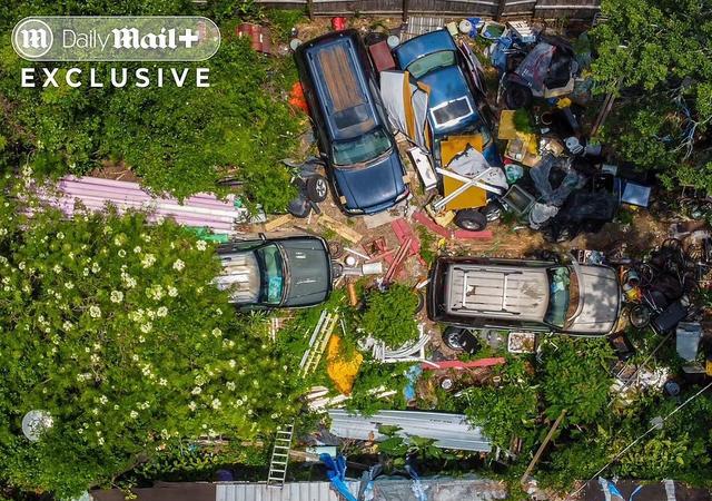 6辆汽车堵在房门口,汽车里外都堆满了垃圾,废弃电器、塑料盒、各种机械垃圾和腐烂的碎屑……整个房子弥漫着一股奇怪的味道。