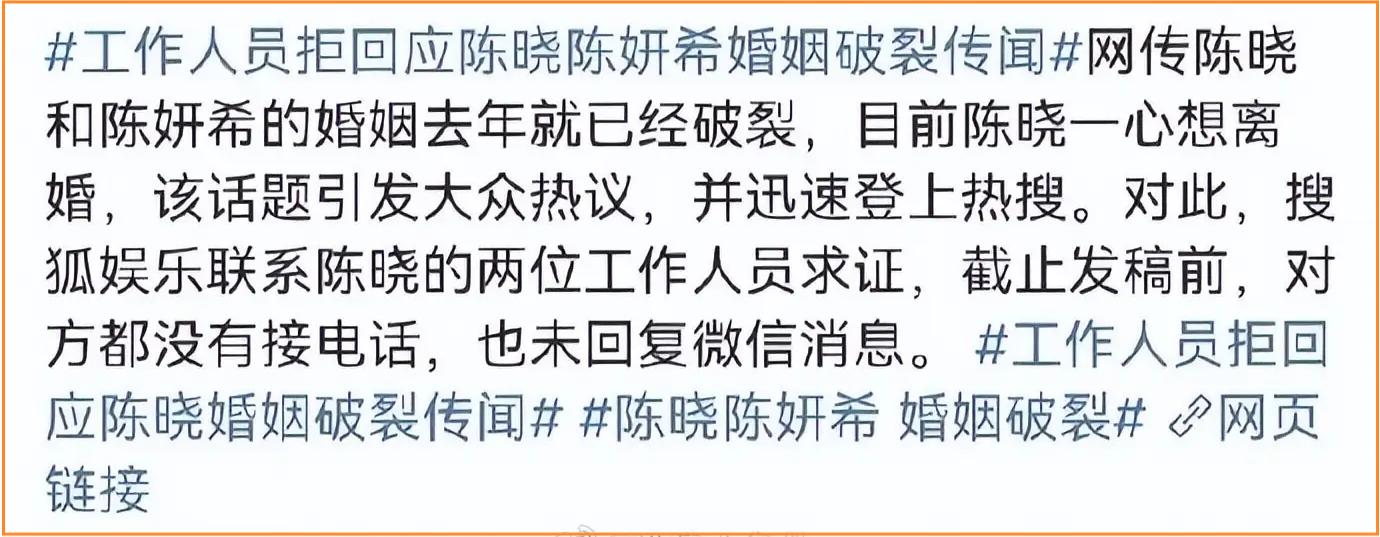 同年12月,陈妍希父亲去世,陈晓未公开悼念,这一系列事件,让婚变传闻甚嚣尘上。