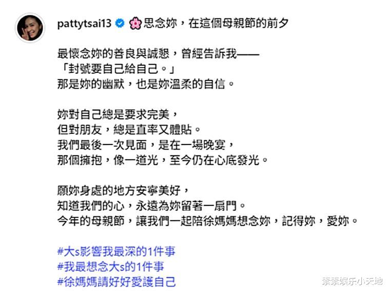 希望大S现在身处的地方安宁美好,今年的母亲节,让我们一起陪徐妈妈想念你,记得你,爱你。