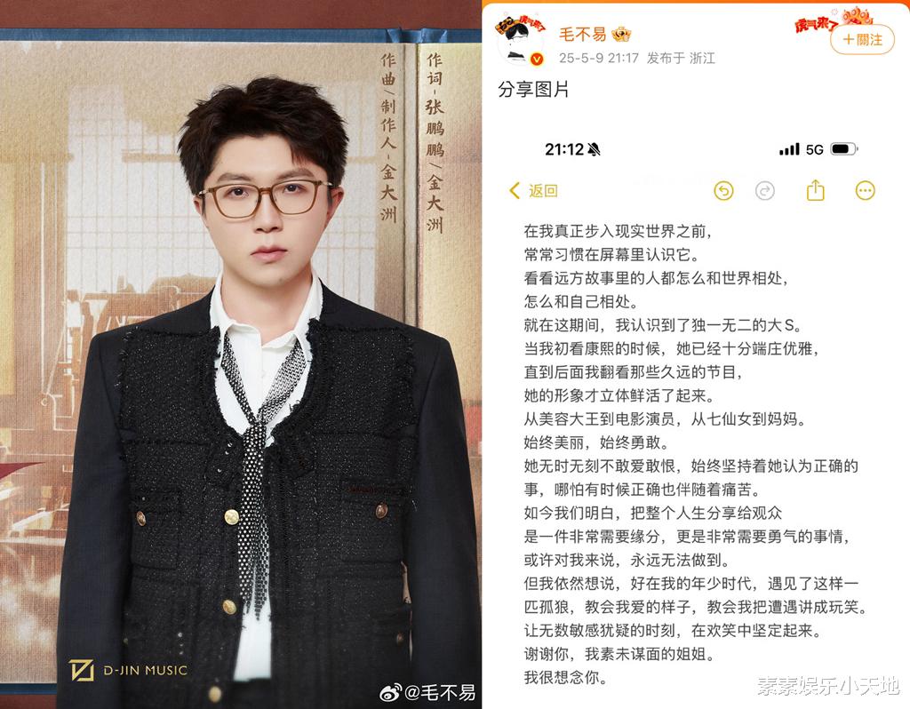 如果说大家都见过大S,那没有见过大S的毛不易也在昨天发文缅怀大S。