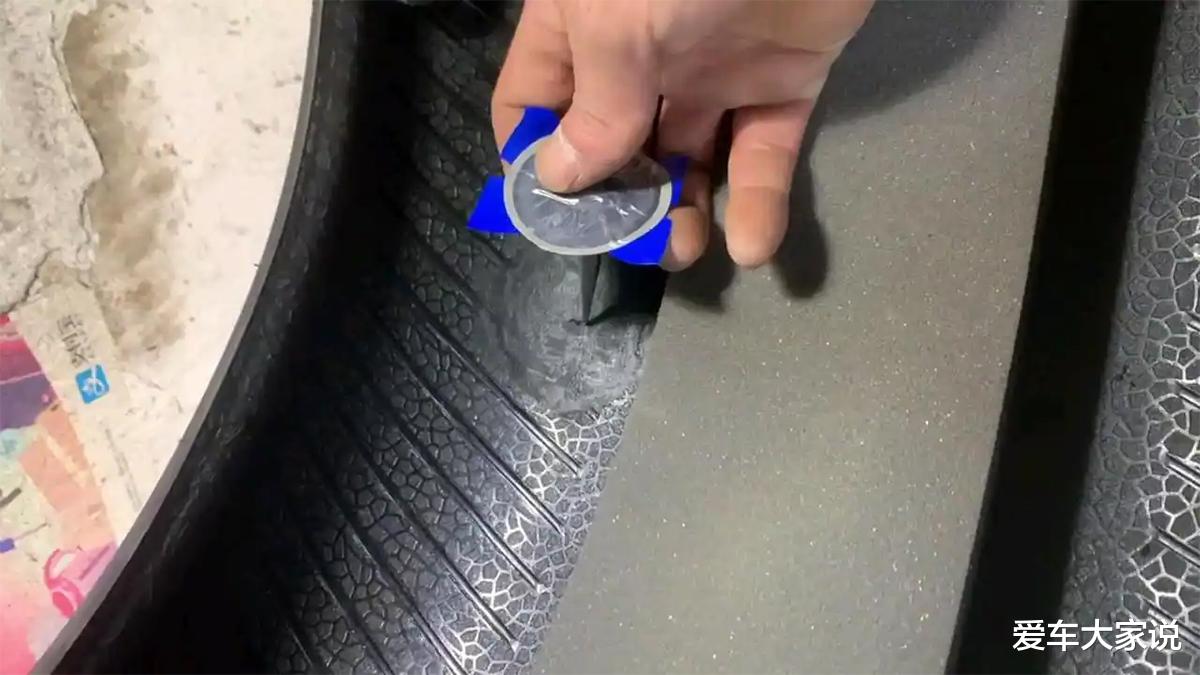 但是要注意,如果是斜着扎的就不能只用蘑菇钉了。因为孔洞一倾斜,蘑菇钉尾部就会弯折,导致有空隙贴不紧轮胎内部,后期漏气的概率很大。这时候最稳妥的方法就是用蘑菇钉的胶条部分填充胎体,然后把内部贴片剪掉,再用补片修补内部,这样最稳妥。