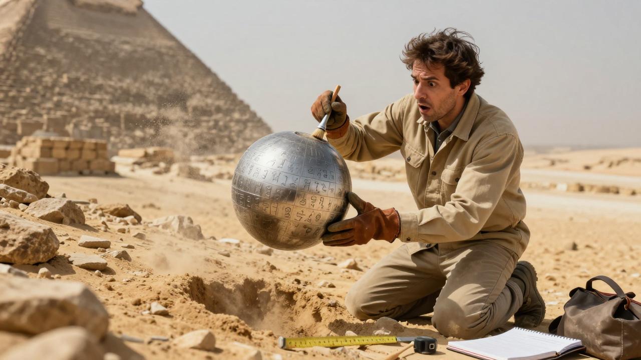 Prompt:人类考古学家在金字塔挖掘现场发现一个旋转金属球的真实手持拍摄,手持纪录片现实主义,真实手持风格。