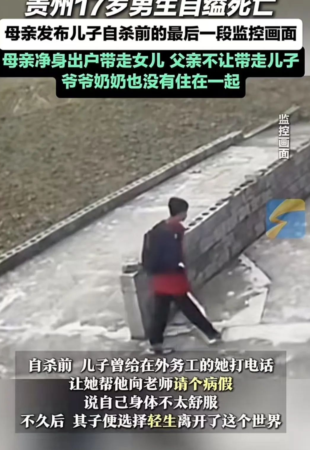 太令人心痛了!贵州,17 岁男孩轻生后,母亲发其生前监控视频,让无数网友泪目!母亲:“前夫不让我带走儿子,我净身出户带走女儿,3 个孩子他是最懂事最乖的,没想到……”网友:希望他下辈子,能活在一个被温柔对待的世界里!
