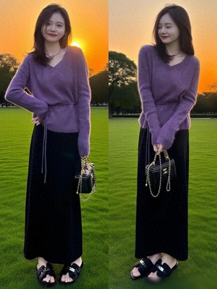 甜妹风可以试试紫色毛衣配白色木耳边裙子。颜色软软糯糯的,鞋子选浅黄或米色,整体很清新。小个子女生穿挺可爱的。