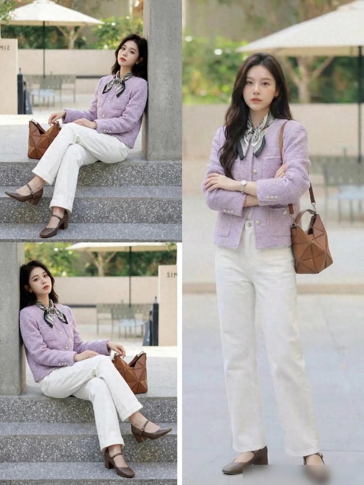 小个子可以试试短款紫色外套配白裤子。拉高腰线很管用,显得人精神。裤子选九分的,露出脚踝,清爽还显高。