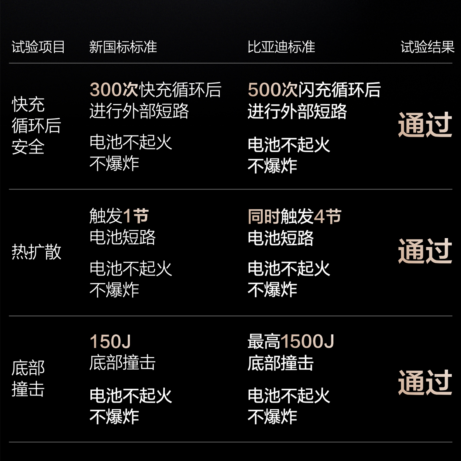 更绝的是安全性!第二代刀片电池历经500次闪充循环后,边闪充边针刺,依旧没有发生热失控、冒烟的情况!这含金量看懂了吗? 500次闪充循环相当于跑了30万公里或开了15年——长期闪充使用,电池依旧很稳。就算是热扩散、底部撞击等极端测试也是统统拿下,甚至挑战新国标10倍能量撞击,电池依旧不起火、不爆炸,稳如老狗。