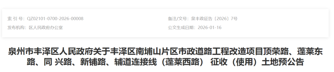 为实施泉州市丰泽区国民经济和社会发展规划、泉州市国土空间规划,根据《中华人民共和国土地管理法》等法律法规的规定,现发布丰泽区南埔山片区市政道路工程改造项目顶荣路、蓬莱东路、同兴路、新铺路、辅道连接线(蓬莱西路)征收(使用)土地预公告: