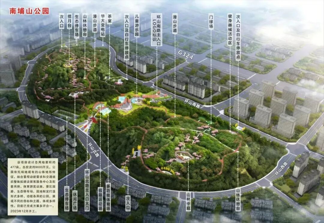 休闲:南埔山公园项目占地约477亩,拟建设旅客服务中心及配套用房、体育游览设施、景区园路、生态停车场和景区生态修复工程。目前,公园的建设工作正在推进中。