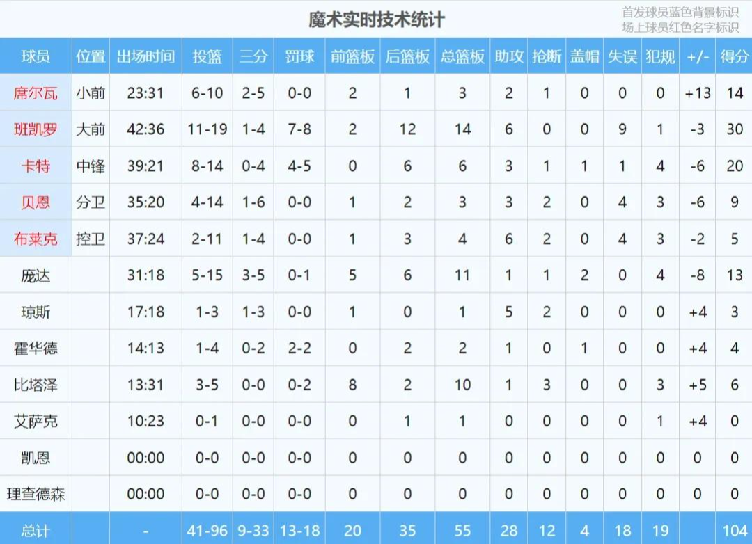 值得一提的是,这两记三分都是打板命中的。班凯罗此役三分4中1,只进了这最后一个。今天班凯罗投篮19中11,三分球4中1,罚球8中7,砍下30分14篮板6助攻9失误,正负值-3。本赛季班凯罗表现不佳,这次绝杀算是自我救赎!