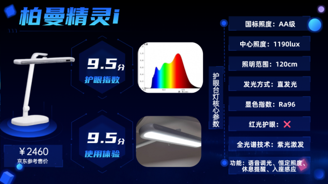 柏曼精灵i整体给人的第一印象就是亮度充足,它采用直发光结构,中心区域照度表现比较突出,达到了1190lux,日常写作业、阅读等场景完全没有压力。在光谱方面同样采用紫光激发技术,蓝光控制表现不错,基本能够满足日常护眼需求,但没有配备红光养护设计,养眼深度相对有限。做工方面则延续了品牌一贯的扎实风格,全金属结构带来了不错的稳定性和质感,同时也增加了耐用度。同时功能配置是其亮点,支持语音调光和恒定照度功能,操作省心便捷,独特的数显屏可实时显示当前亮度参数,这些小细节提升了日常使用的便利性和体验感。