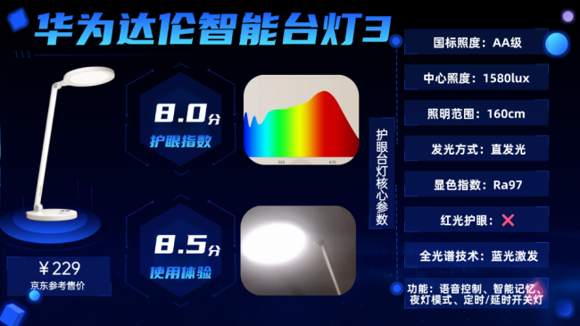 华为达伦智能台灯3它采用全光谱LED光源,同时显色指数达到了Ra97,在阅读绘本或书写作业时,色彩还原比较真实。在光源上用的是16.8cm的圆形发光面,配合全域发光和360度立体光设计,中心照度能到1580lux,符合国AA级标准,照明范围也能覆盖160cm左右,亮度确实很足。不过它采用的直发光有个通病,就是中心区域比较亮,跟边缘亮度差得比较明显,均匀性一般,用的时候可能会有局部眩光的问题。