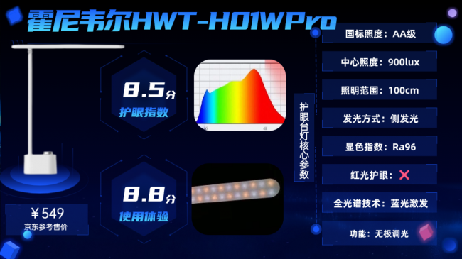 霍尼韦尔HWT-H01WPro它用的是大概20cm的长条形灯头,配合侧发光设计,光线分布还算均匀,能覆盖1米左右的桌面,覆盖范围其实相对来说比较笑了,不过日常看书办公基本够用。它采用普通的全光谱LED光源,显色指数做到了Ra97,色彩还原挺自然的,看文件什么的不会发灰。色温支持3000K到5000K三档调节,从暖黄的深夜模式到偏白的专注模式都能切换,适配不同时段的需求。
