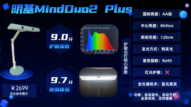 明基MindDuo2 Plus在光线设计上还是花了心思的,它用了鸥翼形的灯头配合多片式反光板,让侧发光能均匀地向两侧展开,在约120cm的桌面范围内营造出比较柔和的照明环境,确实能减少明暗落差。此外它的显色指数有Ra95,色彩还原能力不错,书本颜色看起来也比较真实。不过从光谱结构来看,它没有补全有益红光,对于需要高强度用眼的孩子来说,护眼效果就相对有限了。