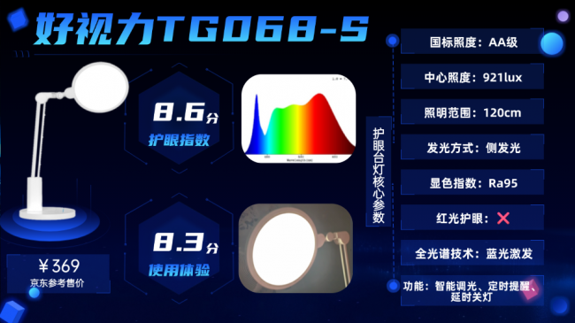 好视力TG068-S它用的是面光源加环形光源的灯头,光线覆盖范围还不错,加上是侧发光设计,整体光线还算柔和,中心照度也达到921lux,日常阅读什么的够用。不过它在距离中心50cm的地方,光线均匀度跑到了2.80,这就意味着书桌上可能会出现明暗对比,万一孩子把书挪到暗区,眼睛就得来回调节,负担会大一些。光谱方面,它用的是蓝光激发全光谱技术,430nm附近的蓝光峰值比较尖锐,数值接近1.0,离理想中的蓝光控制标准还有点距离。