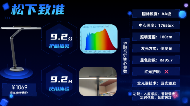 松下致准在护眼表现上首先给人的感受是亮度非常充足,它采用了大尺寸发光面设计,可以让光线铺满整个桌面,所以在读书或者写作业时,视野范围内不会出现明显的明暗对比感。而且它的显色指数表现不错达到了Ra95.7,满足日常读写没啥问题。从更深层的光谱结构来看,它的蓝光控制属于中等偏上水平,光谱连续性也比较好,就是有益的红光比较少一点。