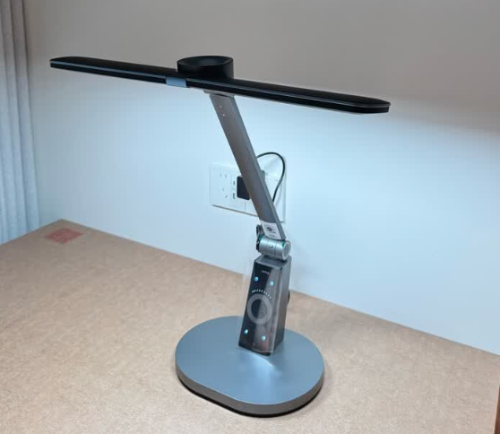 这款台灯最亮眼的就是那个双翼旋转灯头,两个灯头可以独立翻转,配合阻尼转轴和多轴调节的灯臂,上下左右都能调,想照哪就照哪,对大桌面比较友好。功能上配得挺全的,入座感应、智能调光、多档模式切换、定时休息提醒都有,它还有个模式切换环,操作起来挺顺手。外观是深空灰主色调加银灰金属点缀,科技感在线,放现代书桌上不违和。