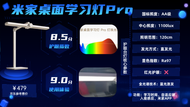 米家这款桌面学习灯Pro的照明表现中规中矩,它用了52cm的双段式加长灯头,能照亮约1.2米的桌面,中心照度大概1100lux,普通的学习桌是够用的,不过它用的是直发光设计,在光滑表面可能会反光,使用的时候要稍微注意下。在光效方面,它的显色指数达到Ra97,色彩还原能力表现不错,书本内容看起来更加接近真实颜色,色温是固定4000K色温,挺适合学习的。光谱方面没做什么特殊处理,护眼效果主要靠基础的全光谱配置撑着。