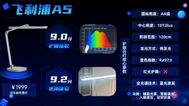 飞利浦A5在光源上做了一些小设计,除了主光源提供桌面照明之外,它还在灯头上面设置了两个辅助光源,主要是向四周发光,显得光线更加柔和一点,让看起来更舒服一点。在光效上,它的显色指数达到了达到了Ra97.9,色彩还原的比较好,同时色温也能在3000K-5000K范围内无极调节,满足不同时间段和使用场景的需求。在光谱上它的连续性是不错的,没有明显的断层,主要就是蓝光的峰值有点高了,达到了1.0,缓解视觉疲劳的效果相对有限。